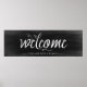 This stylish poster says "welcome" in a white chalk look script calligraphy, and below that is a space for you to personalise however you wish. The background has a chalkboard look.