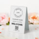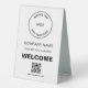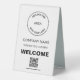 Welcome Company Event QR Code Your Logo White. Handy small sign and stylish way to welcome your delegates or visitors to your company event or work place. Replace the sample placeholder image with your company logo and website QR Code, and easily personalise your company name, website and welcome message. Both sides will update simultaneously. You can also change the font styles and colours if you wish via the Click to Customise Further option as well as the black background. However If you do so please remember to make the changes to both sides as this doesn’t happen simultaneously like when you change the words and logo.