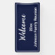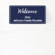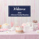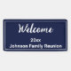 This dark blue family reunion banner has white display text. You can edit the text to show a custom message. The top line of the text is a script that currently says Welcome. The centre line is for the year or date. The final line is for the event name.