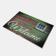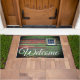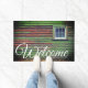 This doormat has a window pictured on it and it says "Welcome" on it.