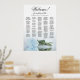 This gorgeous wedding seating chart features a photo of a long-stemmed pale dusty blue or powder blue coloured rose lying on its side reflecting in a pool of water with waves and ripples. The main title reads "Welcome!" with subtitle reading "please find your table" in elegant lacy script calligraphy. There is space for the up to 200 names with the names of the couple and wedding date below. Wonderful way to help your guests find their tables while making your reception more beautiful.