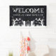 Black and white spooky Halloween party banner or welcome sign with the text "enter at your own risk". Featuring a haunted house door, scary trees with faces, cats, bats, a cemetery with tombstones, and a spiderweb background.