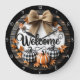 This charming autumn-themed clock features a large tan bow at the top, and "Welcome" in a flowing script in the centre. Below are three pumpkins, one orange and two plaid, surrounded by fall leaves, all set against a rustic wood plank background. The clock has a black outer rim with white numbers 1-12.