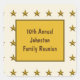 Seal your invitations or add a special touch to favour bags for your next family reunion. These square stickers feature a frame of gold stars. Your event information appears inside a gold rectangle in the centre. All text can quickly and easily be customised.