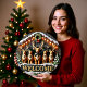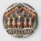 This welcoming clock features a row of five brown reindeer with bells and collars, standing in front of a rustic wooden stable adorned with string lights and a wreath. Snow covers the barn roof and the ground, and two small snowy pine trees flank the group. A sign across the bottom reads "WELCOME" in large, prominent letters. The design may look real due to the high detail and three-dimensional texture in the artwork.