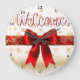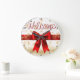 This stunning clock features the word "Welcome" in sweeping red script over a brilliant white background covered in gold snowflakes. A large, luscious red satin bow with gold trim sits prominently at the center, resting on a thick red horizontal band. The design is highly festive, elegant, and uses copious amounts of shimmering gold glitter. The design may look real due to the high detail and three-dimensional texture in the artwork.