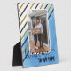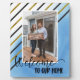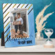 Blue watercolor with black and gold corner stripes. "Welcome Home" photo plaque with easel. Add your image to personalise it before ordering. Ideal photo frame for new home owners or renters. Makes a nice photo gift from husband, wife, family, neighbour, realtor, lender, builder, and nicely complements most home decor.