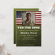 Welcome home party Soldier Custom Photo Army green Invitation. Honour your hero's return with our custom army green Announcement. Personalise it with their name and photo for a heartfelt tribute that will be cherished forever. Welcome them home in style with our cool and unique invite.