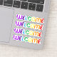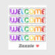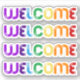 Welcome: a welcoming inclusive message written in rainbow colours. An original take on the rainbow flag!