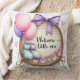 Celebrate the arrival of a precious little one with this adorable Welcome Little One Throw Pillow. Featuring a charming rustic wooden sign design decorated with pastel balloons, baby socks, bows, and heart accents, this pillow brings warmth and sweetness to any nursery or baby space.