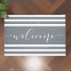 Welcome your guests to your home with your own custom personalised "Welcome" doormat. The design features a minimal and elegant design with "Welcome" displayed in elegant modern calligraphy. The letters extend to the edge with a modern white stripe design. Personalise with the family name and house number.