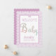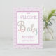 A Welcome New Baby Announcement card designed in soft purple and white with colourful text: BABY, along with the Baby's Name and Birth Date on a white background with purple hearts border. The reverse side includes your Birth Announcement Details, on a soft purple background. To personalise, simply insert the baby's name and other details into our step-by-step template, replacing the sample text. It's fast and easy.