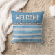 Welcome your guests with this blue and white throw pillow. Rustic design with simulated wood and stripes.