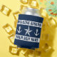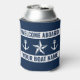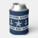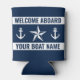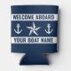 Welcome on board custom boat name nautical star Can Cooler. Custom beverage holder with maritime theme template design. Elegant accessories for beach home, yacht, lake house, cruise cabin, bedroom, sailing boat, beach party etc. Personalised Birthday gift ideas for friends, family, sailor, skipper, fisher, boat captain, dad, husband, grandpa, father, mum and others. Customisable colours. Also great for wedding party. Navy blue and white stripes with anchor symbols and star icons. Double sided print.