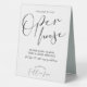 Add the finishing touch to your Open House event with a custom Welcome table top sign. This minimalist black and white real estate sign features modern script fonts that read 'Open House' and 'We hope you Fall in Love' as well as space for your custom text and details. You can even add your realtor details to this Open House table tent sign.