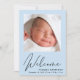 A simple and cute pastel blue baby boy birth announcement. The front features your newborn's photo, full name, arrival date and birth stats, and "Welcome" in a stylish script. On the reverse side, add three additional photos and parent and sibling names, and a thank you, visitation or other message.