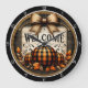 This inviting autumn-themed clock features a large plaid pumpkin front and centre, flanked by two smaller plaid pumpkins and fall leaves. A rustic wooden sign with "WELCOME" in a flowing script hangs above, adorned with a large burlap bow. The clock has a rope-like border and black outer rim with white numbers 1-12.