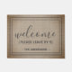 This funny doormat design features the words "Welcome Please Leave By 9". Personalise this cute rustic faux burlap country door mat with your family name and custom greeting. The perfect unique modern housewarming or new homeowners gift.