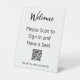 This business sign says Welcome Please Scan to Sign In and Have a Seat We will be with you shortly. All text is black and can be edited. Welcome is in an elegant script. Remember to enter your website URL for the QR code to work correctly.