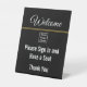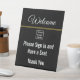 Welcome your visitors with this branded welcome sign. The template includes a display image you can replace with your logo. This black sign has white display text. Also, the display text can be edited to show your desired text. Display text reads: Welcome Please sign in and have a seat Thank You