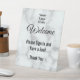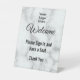 Welcome your visitors with this faux white marble sign featuring your organisation's logo. The display text can be edited to show your desired text. Display text reads: Welcome Please sign in and have a seat Thank You