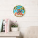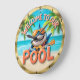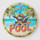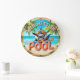 This circular wall clock features a friendly cartoon shark wearing sunglasses and a Hawaiian lei, playing a ukulele. The background is a vibrant beach scene with palm trees and blue ocean water. Bold, orange letters spell out "WELCOME TO OUR POOL" on the sand, creating a fun, inviting atmosphere.