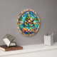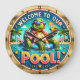 This circular wall clock features a fun cartoon turtle wearing sunglasses and a Hawaiian shirt, floating on an inner tube in a vibrant blue pool. The turtle holds a refreshing drink, surrounded by palm trees and lounging chairs. The words "WELCOME TO OUR POOL!" are prominently displayed, making it a cheerful and inviting piece, all set within a golden, ribbed frame.