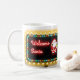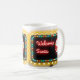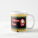 Numerous Christmas lights, neon text and Santa Claus highlight this Welcome Santa holiday billboard coffee mug.