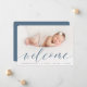 A sweet and elegant birth announcement design featuring a full bleed horizontal or landscape orientated photo with "welcome" overlaid in chic calligraphy script lettering. Your baby's name and birth stats appear beneath. Add three additional square photos to the back, along with a personal message.