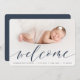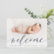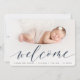 A sweet and elegant birth announcement design featuring a full bleed horizontal or landscape orientated photo with "welcome" overlaid in chic calligraphy script lettering. Your baby's name and birth stats appear beneath. Add three additional square photos to the back, along with a personal message.