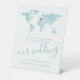 Teal Aqua Turquoise Blue Watercolor World Map Wedding Welcome Sign for a travel theme or destination wedding that's personalised with your reception location, your names, and a moveable heart marking the spot of your adventure, city, beach, or island wedding in any location in the globe. Use the advanced Zazzle template editor to move the heart on the map, or change fonts and background colour to match your colour scheme that coordinates with the faux silver detailed continents map.