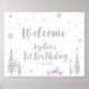 Winter wonderland birthday welcome sign featuring cute snowflakes and the script text in silver glitter texture. Perfect for your winter themed girl's birthday!