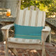 Welcome outdoor pillow features a simple horizontally striped pattern. The top features a simple teal background with "welcome" presented in stylish lower case typography. The bottom features a simple horizontal stripe pattern in a trendy split complimentary colour palette of turquoise, teal and burnt orange. Cool turquoise hues pair perfectly with the warmer shades of burnt orange and teal, giving balance to the colour scheme and just the right pop of colour that can brighten up any patio, garden or outdoor space. Reversible; the back also features the turquoise and orange stripes.