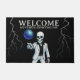 Halloween welcome doormat with the text "Welcome, we've been expecting you". Design featuring a dancing skeleton in a retro white disco suit, with a disco ball, electrified by bolts of lightning. Ideal to welcome your guests to an annual family party.