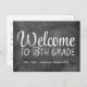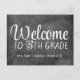 Chalkboard design personalised postcard to welcome new students on the first day of school. Text reads "Welcome to the Xth Grade." The text underneath describes the teacher's name, subject and room number. Cursive message to the student on the back can be customised as well. Bulk discounts available.