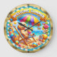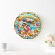 This circular wall clock features an adorable cartoon dog relaxing on a beach chair under a colourful umbrella. The scene is set on a sunny beach with an ocean backdrop and fluffy clouds, surrounded by vibrant flowers and butterflies. Beach accessories like a basket, ball, and seashells complete the joyful summer vibe, all encased in a golden, ribbed frame.