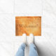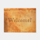 Welcome your visitor with an European style doormat. Italian and mediterranean style, rough, rugged dark coloured terracotta coloured brick wall with the plaster cracked. Warm colours with sunshine. With the text: Welcome!