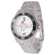 Has heft and feel of expensive stainless steel quartz watches. Good band with safety catch. I removed links, which is easy because engraved arrows show direction to push the linking pins. As always by this seller, the image (a railroad logo) is a perfect reproduction of my emailed image, and is precisely spaced and aligned.