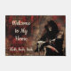 Creepy Grim Reaper image on bloody background with the words "Welcome to My Home. Heh, heh, heh..." emblazoned in mediaeval beige font.