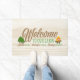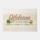 Fun doormat welcoming guests to your cozy cabin. Colorful sign on a faux woodgrain background - Welcome to our Cabin - Nature Walks, Campfire Stories, Making Memories