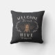 Welcome guests with this cute bee themed throw pillow featuring a vintage style honeybee illustration adorned with botanical leaf detailing. "Welcome to our hive" appears in ivory lettering. Personalise with your family name along the bottom.