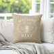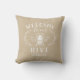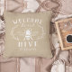 Welcome guests with this cute bee themed throw pillow featuring a vintage style honeybee illustration adorned with botanical leaf detailing on a soft tan background. "Welcome to our hive" appears in white lettering. Personalise with your family name along the bottom.