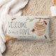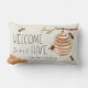 Welcome guests with this cute bee themed lumbar throw pillow featuring watercolor illustrations of honeybees, honeycomb and a hive, with "welcome to our hive" in ivory lettering. Personalize with your family name along the bottom.