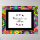 Welcome to our home poster in an art deco art nouveau style pattern. A burst of varied flower shapes and spinning wheels in many vibrant and exciting colours. Lots of different shapes and patterns with petals and circles and more overlap in this art nouveau ornamental styled pattern. A variety of bright and bold colours gives this pattern excitement and fun which is bursting with life. The dominant colours are vivid lime green, sunburst orange, turquoise blue, tangerine and burgundy red. A black bordered frame is placed in the centre with the text: Welcome to our home in an art deco font. Some long stemmed red rose illustration surround the text and adds a touch of elegance.