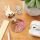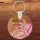 House and vacation rentals are becoming more and more competitive. Set your rental apart from others with this personalised keychain. "Welcome to our home" is accompanied by pale pink leaf silhouettes against a marbled pink and orange background. All text can be customised to suit your needs.