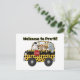 The zebra, elephant,giraffe, and monkey ride the spotted school bus welcoming you to preschool. Text reads "Welcome to Pre-K!".