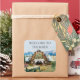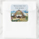 Evergreen Summer Barn 3" Square Sticker. Beautiful historic barn with century old stained glass adorning the front. Decorated for spring and summer weddings and party fun for friends, family. Buffalo and Yak stand in the distance. Use the existing message or personalise the card with your own message and family's or company's name. "Welcome to The Barn"!