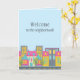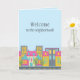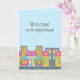 "Welcome to the neighbourhood!" card. The design features a cute urban neighbourhood on a light blue background. Perfect for condos and apartments.