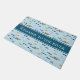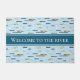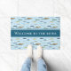 This unique boating themed doormat features a pattern of varied size seafaring vessels on a light blue background - the pattern includes 2 cargo ships, 2 sailing vessels, 2 antique-style wood boats, 1 fishing boat, a rowboat and a houseboat - close inspection of the pattern reveals people enjoying a day on the river - "Welcome to the river" text and its background colour strip can be personalised - "A Day On the River" © katz_d_zynes 2020