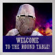 Closeup view of a helmet and an plate armour of a mediaeval knight against the colourful background which imitates the outer space or a battlefield to your liking. Text - Welcome to the round table - added